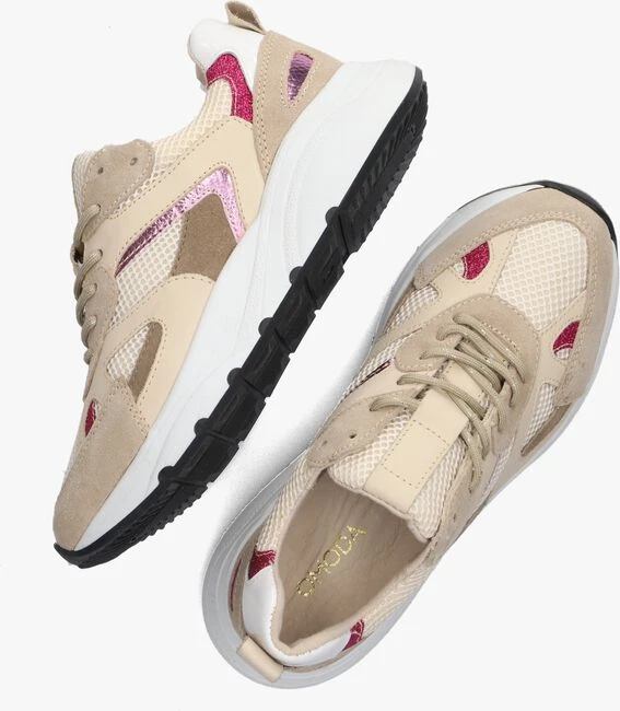 De nieuwste trend van dit seizoen, de running sneaker en deze wil je echt niet missen! Deze sneakers hebben een comfortabel en sportief uiterlijk en lopen ook nog eens heerlijk. Eindelijk eens trend die niet op gaat in het gezegde: “Wie mooi wilt zijn moet…”. Deze beige sneaker CIBEL voldoet aan al onze wensen en komt uit de collectie van het eigen OMODA merk. Dit model heeft een bovenwerk van mesh textiel met panelen van leer een suède in een witte, beige en taupekleurige kleur. Extra leuk zijn de roze accenten met glitters en metallic. Opvallende accenten zijn de veters en de aantreklus om ‘m nog makkelijker aan- en uit te trekken. De voering bestaat uit textiel en het uitneembare voetbed is gemaakt van leer. De sportieve chunky zool met lijntjes reliëf op de zijkant maakt dit model helemaal af. De zwarte loopzool zorgt voor enorm veel grip en stabiliteit. Draag ze lekker sportief met je favoriete jeans of casual met je favoriete jurk!