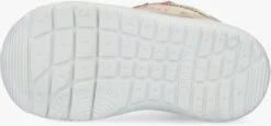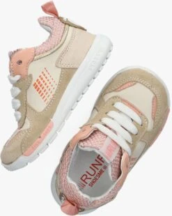 SHOESME is hét merk die weet waar je kinderen mee kunt verrassen. Dat doen ze door hun vrolijke kleurtjes, printjes en door de laatste trends te volgen. Maar zij weten ook precies waar je de ouders blij mee maakt. En dat is natuurlijk een goed voetbed, een goede ondersteuning van de voet én heel belangrijk, dat de schoentjes tegen een stootje kunnen. Deze lage sneaker RF22S005 komt uit de Run Flex collectie en is zeer geschikt voor de kindjes die al aardig kunnen lopen maar nog wel een flexibele zool nodig hebben. De buitenkant is gemaakt van stevig beige leer met panelen van beige suède en roze details. Zo is de tong en enkelkraag gemaakt van roze grof gebreid textiel, bevat de tong een semi transparant rubber label met roze merkopdruk en is de zoolrand speels afgewerkt met merkreliëf en roze inzetstukken. Opvallend detail is de goudkleurige bies met rubber merkembleem op de hiel en het textiele aantreklusje achterop. Het binnenwerk is uitgevoerd in leer en heeft een uitneembaar voetbed. En met de vetersluiting kan je kindje goed leren veters te strikken. De rubberen zool heeft een gripvast profiel en buigt goed mee met de voet. Een ideaal schoentje voor leergierige kinderen.