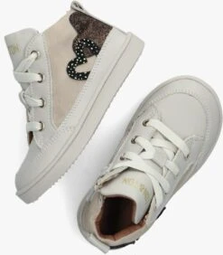 Deze opvallende sneaker komt uit de schoenencollectie van het merk TON & TON. Dit hoge model is uitgewerkt in beige leer en suède. Leuke details: het merkembleem op de tong, de twee hartjes op de buitenzijde, de aantreklus en metalen veterringetjes. Je trekt ‘m gemakkelijk aan en uit door de ritssluiting aan de binnenzijde. De voering is gemaakt van bruin leer en heeft een zacht uitneembaar voetbed. De rubberen zool heeft een gekartelde loopzool met gripvast profiel.