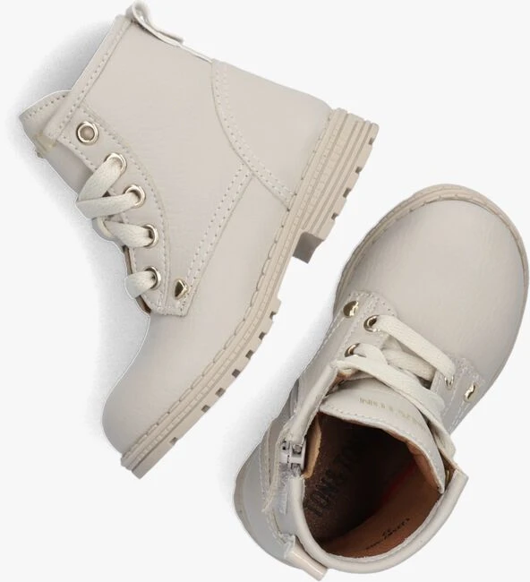 Ga voor stoer, comfortabel en alledaags met deze toffe veterboots VIOLA uit de collectie van het stoere merk TON & TON. De buitenkant is gemaakt van beige gestructureerd leer en is voorzien van mooie verfijnde stiksels en toffe accenten. Zo heeft de boot twee goudkleurige hartjes emblemen, goudkleurige veterringetjes en een lakleren aantreklus. Het binnenwerk heeft een heerlijke zachte voering van leer en is voorzien van een uitneembaar voetbed met een lederen toplaag. Dankzij de ritssluiting trek je ‘m gemakkelijk aan en uit en hoef je niet iedere keer de veters te strikken. Leuk detail is het goudkleurige merkopdrukje op de tong. De rubberen zool is voorzien van een gripvast maar fijn profiel. Een heerlijke boot om onder alle outfits te kunnen combineren!