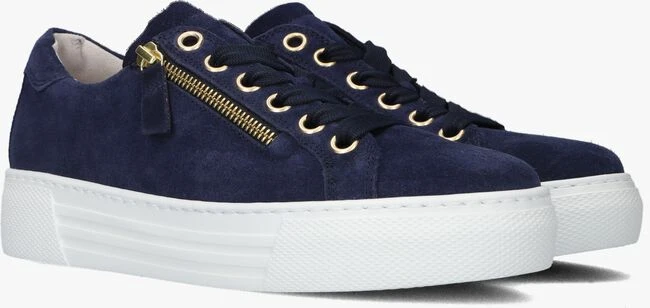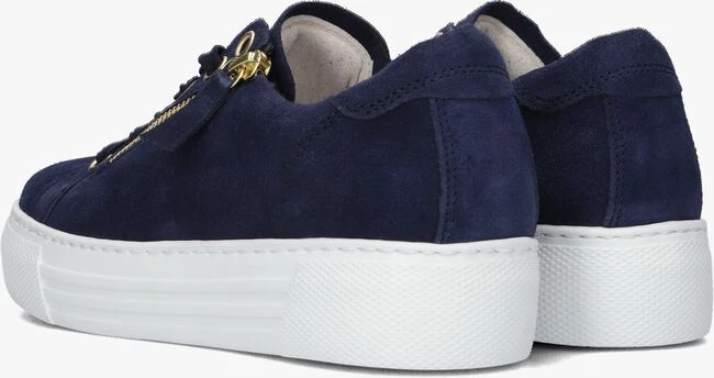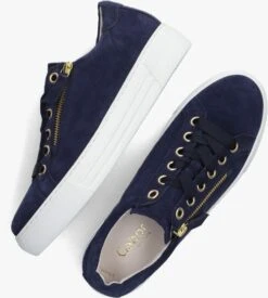 Deze donkerblauwe lage sneaker 465 komt uit de Comfort collectie van het merk GABOR. Comfort schoenen hebben meer volume bij de tenen en bij de bal van de voet en bieden voor iedere voet de noodzakelijke ruimte. Dit model is uitgevoerd in hoogwaardig suède en is afgewerkt met goudkleurige accenten, de rits, de metalen veterringetjes en het inzet stuk op de hiel. De binnenvoering is een combinatie van suède en badstof en het voetbed is uitneembaar. Met de handige rits langs de veterklep trek je ‘m makkelijk aan en uit. De schoen heeft een plateau zool van 4 centimeter dik met een gestreept reliëf op de zijkant en stootranden van reliëf rondom de neus en hiel. Dit model is gemakkelijk te combineren met een stoere jeans.