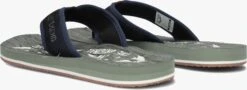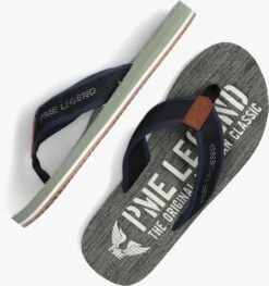 Deze slippers JETFLAP van PME LEGEND zijn tijdens de warme dagen altijd goed! Dit model heeft een bovenwerk van donkerblauw textiel met een wit merkembleem dat afgewerkt is met donkerblauw mesh textiel. Het middenstukje is voorzien van bruin leatherlook met stiksels en het teenstukje is gemaakt van zacht textiel, zodat je een fijn comfort ervaart en het niet gaat irriteren. De band is textiel gevoerd en het groene voetbed met print en oversized merkopdruk heeft een comfortabel gevoel door de gewatteerde stukjes. De witte accentstreep in de tussenzool maakt dit model net wat opvallender en de bruine loopzool met gripvast profiel zorgt voor goede stabiliteit bij het zwembad, op het strand en door de stad!