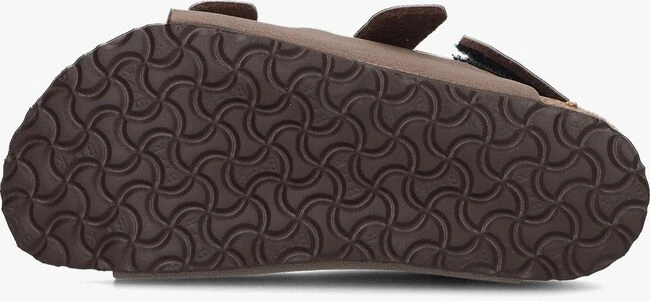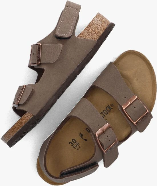 Deze bruine sandalen MILANO HL KIDS zijn van het merk Birkenstock. Dit model heeft een bovenwerk van bruin leatherlook met twee banden over de wreef die voorzien zijn van een gespsluiting, zodat je dit model goed passend aan je voet kunt maken. Het hielbandje heeft een klittenbandsluiting, zo trek je ‘m super gemakkelijk aan- en uit en blijft het sandaaltje ook nog goed aan je voet zitten! De banden zijn gevoerd met zacht textiel en het voorgevormde voetbed met suède toplaag zorgt voor een heerlijk comfort. De kurken tussenzool zorgt voor nog meer steun en de rubberen loopzool heeft een gripvast profiel, zodat je kleintje kunt rennen, spelen en klimmen zonder uit te glijden!