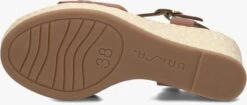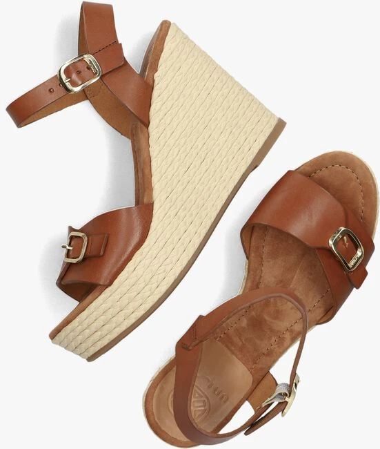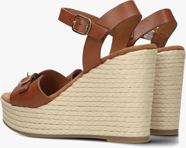 Unisa is een Spaans merk dat bekend staat om het maken van stijlvolle en comfortabele schoenen. Deze sandaal met sleehak MELAO is daar een perfect voorbeeld van. De buitenkant is gemaakt van bruin leer met goudkleurige gespsluitingen op de voorvoet en enkelbandje. Het voetbed bestaat uit zacht suèdelook en de bandjes zijn gevoerd met leer, wat zorgt voor extra comfort. De sleehak heeft een gevlochten patroon in een roomwitte kleur en is 11 centimeter hoog, wat zorgt voor een elegante en zomerse look. Het plateau onder de voorvoet heeft een hoogte van 3,5 centimeter. De rubberen loopzool heeft een gripvast profiel, waardoor je altijd stabiel en comfortabel kunt lopen. Deze sandaal is perfect voor de zomer en kan onder vele outfits gedragen worden!