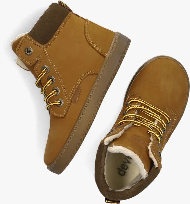 Deze stoere cognac kleurige veterschoen 45825 met stoere accenten van het merk DEVELAB is een heerlijke schoen voor urenlang speelplezier. Dit model is gemaakt van nubuckleer met een bruine enkelkraag van suède en heeft toffe accenten. Zo prijkt er op de schacht een textiel aantreklus, hebben de veters een bruin met gele kleur, heeft het bovenwerk fraai stikwerk en is het merkreliëf te vinden de tong, zijkant en veterringen. De binnenvoering bestaat uit faux fur en het zachte, uitneembare voetbed is gemaakt van textiel. De rubberen zool is afgewerkt met een stevig stiksel in de zoolrand en heeft een gripvast profiel, zodat je mannetje goed kan rennen en klauteren.