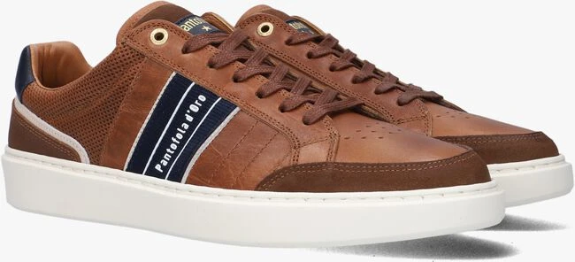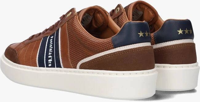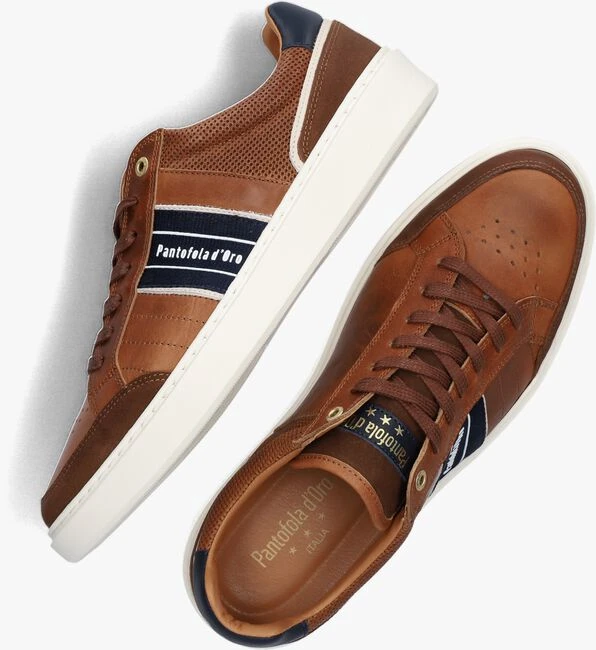 Uit de collectie van Pantofola d’Oro komt deze lage sneaker LACENO UOMO LOW. Dit model bestaat uit cognackleurig leer met suède overlays en heeft toffe, donkerblauwe accenten. Zo is de tong voorzien van een leren merklabel met goudkleurig reliëf, heeft de zijkant een textiele bies met een wit merkembleem. Ook hebben de metalen veterringen een goudkleurige kleur, heeft de voorvoet perforaties en is de hiel voorzien van drie goudkleurige sterren. De sneaker is met cognackleurig leatherlook en textiel gevoerd. Je ervaart een fijn comfort dankzij de gewatteerde tong en enkelkraag en door het uitneembare voetbed. De rubberen zool loopt iets op en de loopzool is erg gripvast.