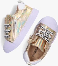 SHOESME is hét merk die weet waar je kinderen mee kunt verrassen. Dat doen ze door hun vrolijke kleurtjes, printjes en door de laatste trends te volgen. Maar zij weten ook precies waar je de ouders blij mee maakt. En dat is natuurlijk een goed voetbed, een goede ondersteuning van de voet én heel belangrijk, dat de schoentjes tegen een stootje kunnen. Deze leuke lage sneaker SH22S001 is hier zo’n voorbeeld van! De buitenkant is gemaakt van goudkleurig leer met een holographic folie en opvallende veters met merkopdruk. Naast de vetersluiting is dit model voorzien van een ritssluiting waardoor je veel gemak ervaart bij het aan- en uittrekken en niet iedere keer de veters hoeft te strikken. De neus heeft een extra rubberen laag gekregen waardoor de schoen goed tegen een stootje kan en langer mooi blijft, ook als ze nog veel op de grond spelen. Het binnenwerk is uitgevoerd in leer met een geperforeerd en uitneembaar voetbed voor een optimale ventilatie. De rubberen zool met gripvast profiel is stevig en tegelijkertijd ook soepel zodat de voet goed kan afwikkelen.
