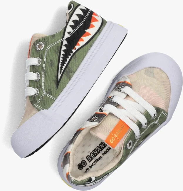 GO BANANAS! Dat gaat zeker lukken met deze leuke lage sneakers SHARK uit de collectie van dit vrolijke merk, die op ieders gezicht een lach weet te toveren. De buitenkant is gemaakt van canvas textiel in de kleuren groen, oranje, grijs en beige en is voorzien van diverse prints. Zo vind je aan de ene kant een groene print met een haai, aan de andere kant een streepjespatroon met tekst en de tong heeft een camouflage print. Een leuk detail is het banaantje achterop de hiel. Op de tong prijkt een oranje lederlook label met goudkleurig merkopdruk en de platte witte veters maken het helemaal af. Extra handig is de witte rubberen stootneus, hierdoor kan de schoen tegen een stootje en blijft de schoen langer mooi. Want bij het klim en klauteren, buitenspelen of een potje voetballen mag niets in de weg staan! Het binnenwerk heeft een canvas voering en een uitneembaar voetbed. De zwarte loopzool is voorzien van een gripvast profiel.