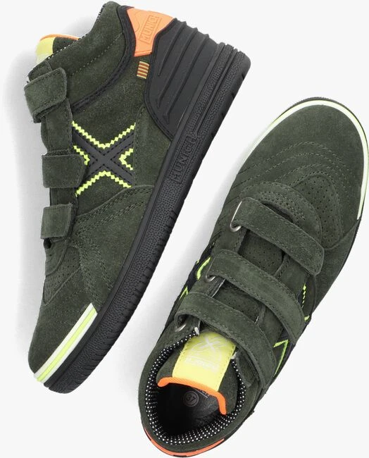 De schoenen van MUNICH kenmerken zich door de vele kleuren, materialen, structuren, prints en combinaties. Elke schoen van dit merk heeft daardoor een uniek en speels uiterlijk wat veel kinderen aantrekt. De buitenkant van deze hoge sneaker G3 VELCRO is gemaakt van groen suède en heeft een opvallend geel textiel merklabel aan de tong en hiel en een cool ribbel hielstuk. De neus is voorzien van een extra sterkte stootrand voor optimale bescherming van de neus. Opvallend zijn de neongele, oranje en zwarte accenten en de kenmerkende X aan de zijkant van de schoen. De voering is gemaakt van mesh en het voetbed is uitneembaar. Dankzij de klittenbandsluiting trek je ‘m gemakkelijk aan en uit en door het gripvaste profiel onder de rubberen zool ervaar je veel grip en stabiliteit bij alle activiteiten.