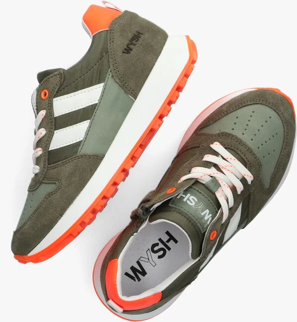Hét nieuwe schoenenmerk voor coole kids, WYSH, staat voor Wear Your SHoes en is voor eigenwijze types die hun eigen stijl volgen. Oftewel, doe je ding! Draag op ieder moment de schoenen die jij wil, op iedere manier die jij tof vindt. De trendy modellen zijn uitgevoerd in hoogwaardige materialen en zijn met zorg ontworpen voor snel groeiende voeten. Dit lage sneaker model WOLF is uitgevoerd in een materialenmix van leer, textiel en suède in de kleuren groen, wit en feloranje. Het binnenwerk heeft een gecombineerde voering van leer en lederlook materiaal met een uitneembaar voetbed. Op de tong is een merklabel te vinden, de hiel heeft een merkopdruk en de zijkant is gesierd met twee witte bandjes. De oplopende witte rubberen zool met feloranje loopzool zorgt voor een opvallende look en de loopzool is voorzien van een grof profiel voor veel grip bij het rennen en spelen. Durf eigenwijs te zijn met WYSH!