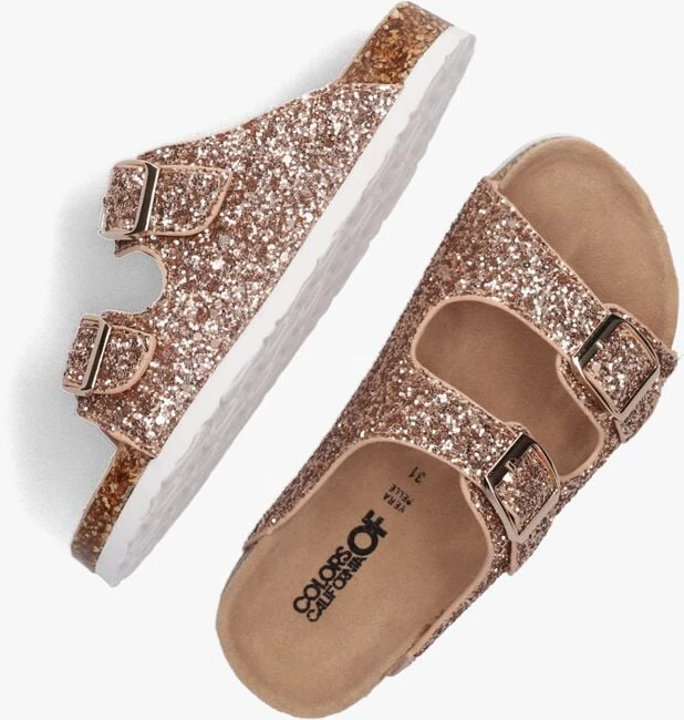 Het unieke merk Colors of California is er voor iedereen die houdt van eigentijdse stijlen in verschillende kleuren en printjes. California staat symbool voor vrijheid waarin iedereen zichzelf kan zijn. Deze unieke slipper BIO IN GLITTER heeft twee bandjes die afgewerkt zijn met all over roze glitters en goudkleurige gespen. Je draagt dit model gemakkelijk iets strakker of losser met de verstelbare bandjes. De voering is gemaakt van leer met een voorgevormd voetbed met een suède toplaag. De zool is opgebouwd met een tussenzool van kurk en een witte rubberen loopzool met een grof profiel voor enorm veel grip tijdens al je zomerse avonturen. Ga stralend op stap met deze glinsterende slippers en show jouw unieke stijl!