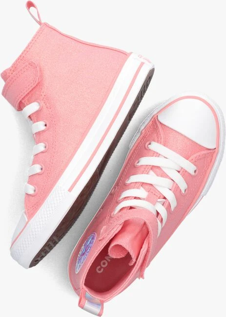 Met deze hoge sneakers CHUCK TAYLOR ALL STAR 1V van CONVERSE zit je helemaal goed! Deze schoenen hebben een bovenwerk van roze canvas met glitters. Uiteraard vind je de kenmerkende converse details terug zoals de rubberen neus, de stootrand met roze accentstrepen en de merkopdruk op de hiel. Extra tof is de metallic merkpatch op de schacht en de aantreklus op de hiel met folieprint. Het binnenwerk heeft een voering van fijn mesh en vast voetbed. Dankzij de elastische veters in combinatie met het bandje met klittenband trek je ‘m gemakkelijk aan en uit. De rubberen zool is voorzien van een fijn maar gripvast profiel.
