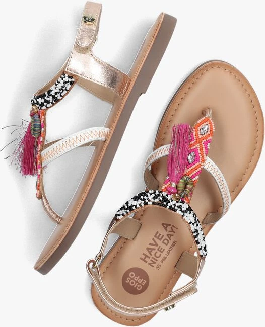 Geïnspireerd op de mediterrane stijl geeft het merk Gioseppo zijn eigen draai aan deze sandaaltjes. Van dit model COROACI word je helemaal blij! De buitenkant is gemaakt van roze, glanzend leer met gekleurde kraaltjes over de voorvoet in de kleuren zwart met wit en roze, lichtroze en oranje. Ook loopt er over de wreef een wit, leer bandje met een opvallend oranje stiksel. Extra tof zijn de diamantjes, het paarse kwastje en de gekleurde schelp met textiel. Het enkelbandje is voorzien van een goudkleurige merkstud en met de klittenbandsluiting trek je ‘m super snel aan-en uit en maak je hem goed opmaat naar jouw voet. De leren voering en het leren voetbed met dempende schuimlaag bieden comfort en het rubberen loopzooltje zorgt voor een goede grip en stevigheid. Ga eropuit met deze te gekke zomerse sandaal!