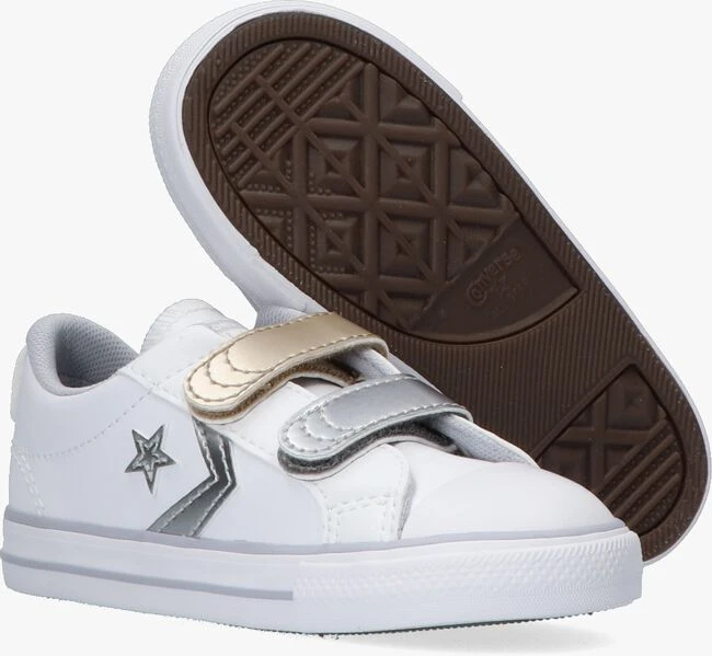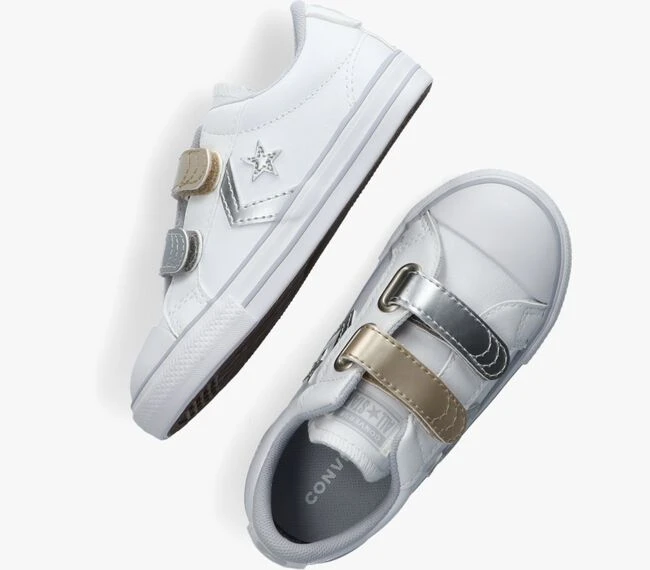 Deze witte STAR PLAYER 2V METALLIC lage sneaker van het bekende schoenenmerk CONVERSE is eindeloos te combineren bij al je outfits! De opvallende rubberen neus en stootrand met zilvergrijs accentstreep geven deze schoen de kenmerkende Converse-look. Extra leuk is de klittenbandsluiting in zilver en goud en het bijpassende merkembleem aan de zijkant van de schoen in de kleur zilver. De schoen heeft een bovenwerk van wit leer met een mesh voering en een uitneembaar voetbed en een rubberen zool met gripvast profiel. Combineren is niet moeilijk want dit model en kleur past bij ontelbare outfits!