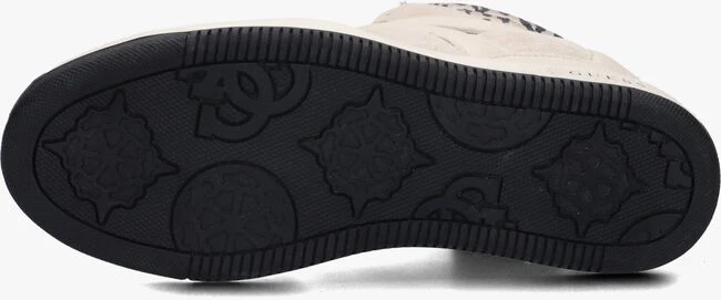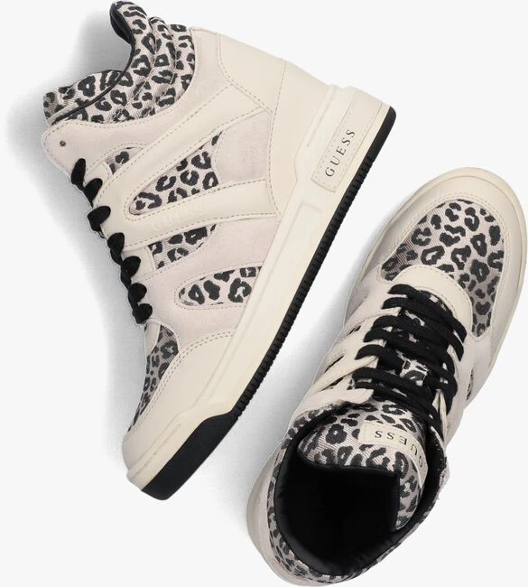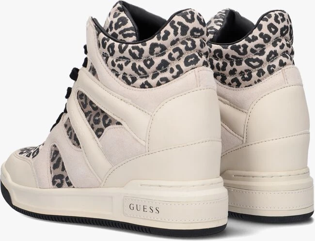 Deze hoge sneaker LISA met wedge van het merk GUESS is gemaakt van roomwit nubuckleer en suède met goudkleurig panterprint. Met dit model pak je onopvallend wat centimeters mee! Toffe details zijn de gewatteerde overlays, de gewatteerde enkelkraag, de merkemblemen op de tong en zijkant en de zwarte veters. De voering is gemaakt van zwart textiel en het voetbed van leatherlook is uitneembaar. De rubberen zool met leatherlook inzet en merkembleem heeft een zwarte loopzool met gripvast profiel. Combineer ‘m onder een leuke jurk of skinny jeans!
