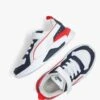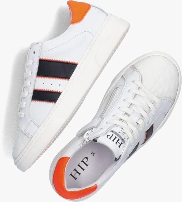 Deze hippe lage sneakers H1261 komen uit de collectie van het merk HIP. De buitenkant is gemaakt van wit leer met een een opvallend neon oranje hielcap. Op de zijkant bevinden zich donkerblauwe side strepen met neonoranje kartelrandjes met perforatiegaatjes voor een optimaal ademend vermogen. De neus heeft een rubberen afwerking met 3D print, voor extra bescherming en zorgt ervoor dat de neus langer mooi blijft. De voering is gemaakt van leer en het voetbed is uitneembaar. Je trekt ze super snel aan en uit dankzij de ritssluiting naast de vetersluiting. De rubberen zool heeft een gripvast profiel, zodat je kleine man goed kan spelen op deze sneakers.