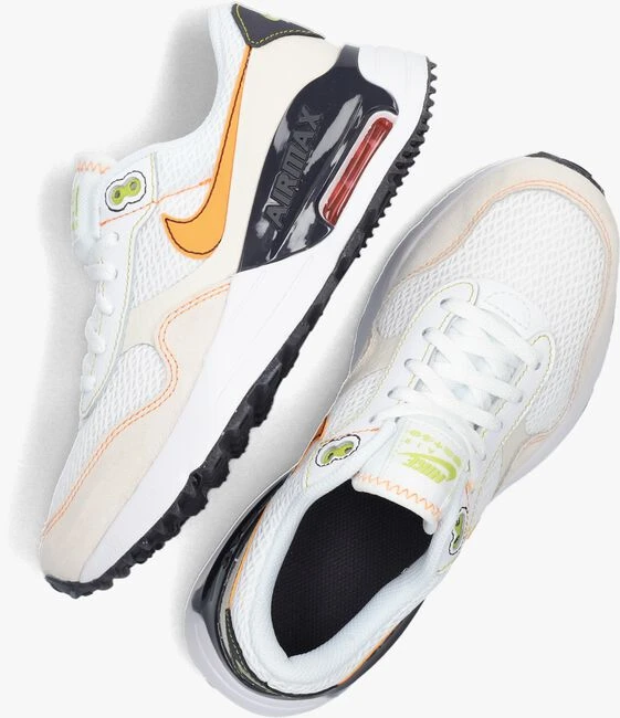 Een eerbetoon aan de klassieke AIR MAX, dat is dit vernieuwde model AIR MAX SYSTM (GS)S uit de collectie van het merk NIKE. De buitenkant heeft oranje stiksels op het bovenwerk van wit mesh textiel in combinatie met beige suède en leatherlook. De tong is voorzien van een groen label, op de zijkant bevindt zich het oranje Nike swoosh logo en de grijze hielcap heeft een groen merkembleem. De sneaker is mesh gevoerd en je ervaart nog meer comfort dankzij de gewatteerde enkelkraag. Opvallend is de rubberen zool met grijze, Airmax inzet en heeft een transparant luchtkussen met een oranje afwerking onder de hiel. De loopzool is afgewerkt met een gripvast profiel.