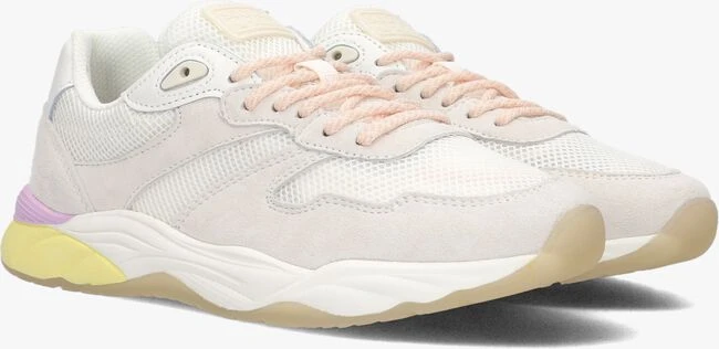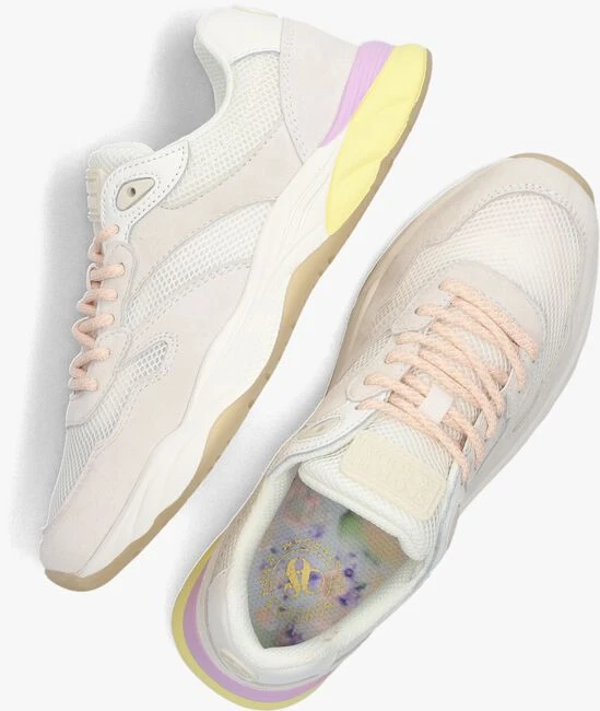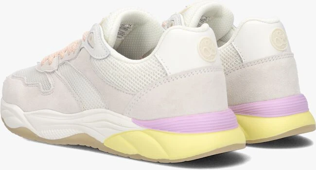 Dit heerlijke seizoen verdient een vrolijke sneaker! Ga voor deze witte sneaker CELEST 2.0 uit de collectie van het Amsterdamse couture-merk SCOTCH & SODA. De buitenkant is gemaakt van glanzend mesh met beige overlays van suède. Opvallend detail is het ronde rubberen merkembleem op de leren hielcap, het rubberen merklabel op de tong, de paarse hielstabilisator en de wit met roze veters. Het binnenwerk is gevoerd met mesh textiel en heeft een vast voetbed. De witte oplopende rubberen zool is voorzien van een gele inzet en de transparante loopzool heeft een gripvast profiel die een goede grip en stabiliteit biedt op iedere ondergrond.