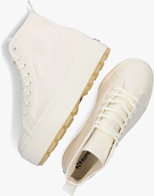 Uit de collectie van het Italiaanse merk Superga is deze trendy hoge sneaker 2708 HIGH TOP TANK met vetersluiting en gigantische plateauzool. Dit model is geheel uitgevoerd in off white canvas en heeft een vaste binnenzool. Dit casual exemplaar is afgewerkt met biezen, witte veterringetjes en een textiel merklabel langs de veterklep. Met de handige textiele aantreklus achter op de schacht trek je dit model eenvoudig aan-en uit. De dikke rubberzool van 5 centimeter hoog zorgt voor comfort en tilt iedere outfit letterlijk en figuurlijk naar een hoger stijlniveau. Opvallend is het fijn reliëf rondom de neus en het rubber merkembleem bij de hiel. De stevige loopzool is uitgevoerd in rubber en heeft diepe groeven voor onwijs veel grip.