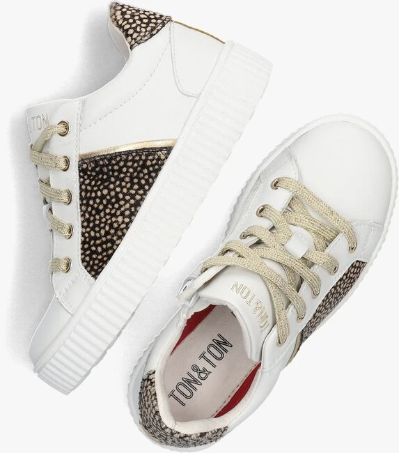 Het merk TON & TON heeft een uitgebreide collectie voor de stoere binken en de hippe meiden. Dit hippe, jonge en trendy merk zorgt ervoor dat opgroeiende kids stevige schoenen kunnen dragen welke gemaakt zijn van soepele materialen zodat kids zorgeloos kunnen ravotten. Ben jij ook zo dol op die trendy animalprints? Dan is deze lage sneaker NORELL echt iets voor jou! De buitenkant is gemaakt van wit leer met een zijkant en hielcap van ponyhair. Opvallend zijn de goudkleurige details, zoals de bies op de zijkant en hiel, de metalen veterringen, de glitter veters en het merkreliëf op de tong. Het binnenwerk heeft een leatherlook voering en een uitneembaar, leren voetbed. Voor extra steun en nog meer comfort is de enkelkraag licht gevoerd en je trekt ‘m super gemakkelijk aan en uit dankzij de ritssluiting naast de veterklep. De rubberen zool zorgt voor een uitstekende grip tijdens het klimmen en klauteren.