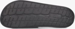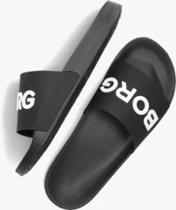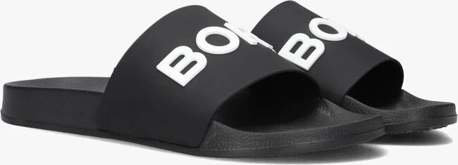 Deze zwarte lichtgewicht badslipper KNOX MLD MET W komt uit de collectie van het merk BOSS. Dit model heeft een glad rubberen band met oversized witte merkopdruk en een rubberen licht voorgevormd voetbed. Het profiel onder de loopzool zorgt voor een goede grip.