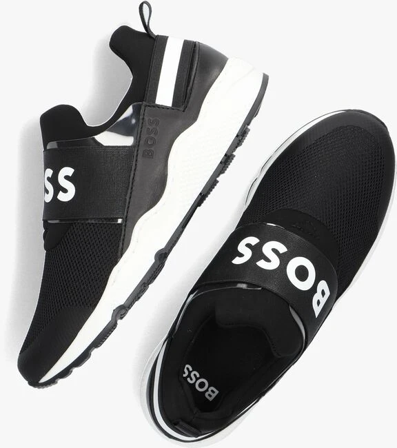 Met deze lage sneaker J29335 uit de collectie van het merk BOSS KIDS ben jij verzekerd van een comfortabele gevoel. De buitenkant is gemaakt van zwart mesh in combinatie met neopreen en heeft een rubberen afwerking aan de neus ter bescherming. Opvallend is de brede elastieken band over de wreef met wit merkopdruk en transparant detail. Ook die hiel is voorzien van een elastieken band en een textiel aantreklusje voor een gemakkelijke instap. Het binnenwerk heeft een neopreen voering wat erg zacht en comfortabel aanvoelt en beschikt over een uitneembaar voetbed. De witte rubberen zool heeft speelse vormen en reliëf en een zwarte loopzool met gripvast profiel.