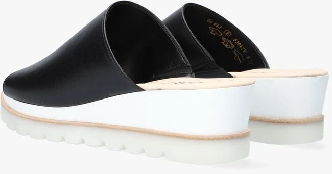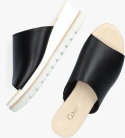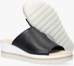 Ga voor een verfijnde look met deze zwarte slipper met oplopende zool van het merk GABOR! Dit vrouwelijke model heeft een bovenwerk van soepel leer met een brede banden die over de wreef loopt. Het voetbed is gemaakt van zacht beige leer en is voorzien van een licht dempende laag voor extra loop comfort. Een mooi detail is dat de zool in drie lagen is opgedeeld, wit micro rubber, een houtachtige laag en een rubberen zool in een transparante kleur, waardoor de sandaal een moderne touch krijgt. De rubberen zool heeft een gripvast profiel en de zool loopt op van 2 centimeter onder de voorvoet naar 5 centimeter onder de hiel gemeten. Combineer ‘m bij jouw mooiste zomeroutfit!