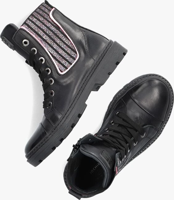 Het familiebedrijf JOCHIE & FREAKS maakt al sinds 1951 modieuze baby- en kinderschoenen. Dat doen ze met veel passie, aandacht en ambacht. Alleen de beste materialen worden gebruikt en dat zie je in ieder ontwerp terug. Deze zwarte veterboot CHARLIE is gemaakt van leer en heeft elastische zijpanden met roze en glitter voor extra loopcomfort. Stoer accent is het rubberen merkembleem op de tong en de opstaande neusnaad die zorgen voor een speelse finishing touch. Dankzij de handige zijrits kan jouw kleine meid deze fijne schoen zelf aan- en uittrekken en heb jij je handen vrij. De leren voering met uitneembaar, dempend voetbed zorgt voor een hoog comfort en de rubberen zool met grof profiel heeft een hoge flexibiliteit, maar zorgt ook voor een stoere uitstraling.