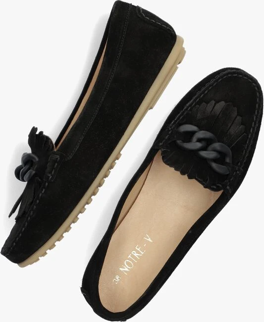 De elegante Italiaanse ontwerpen van het merk NOTRE-V zijn er voor de verfijnde vrouw die er graag effortless chic uit wil zien. Gemaakt van luxe materialen met subtiele accenten en een knipoog naar de laatste trends. Deze zwarte loafers 03-013-02 zijn gemaakt van soepel en zacht suède en is voorzien van een mat zwarte schakelketting met een een suède paneel met franjes op de wreef. Dit model is leer gevoerd met een vast voetbed en een suède hielstuk voor extra comfort. De amber bruine zool heeft een noppenprofiel voor onwijs veel grip en stabiliteit. Met deze mooie mocassin geef je ieder outfit een chique en vrouwelijke uitstraling!