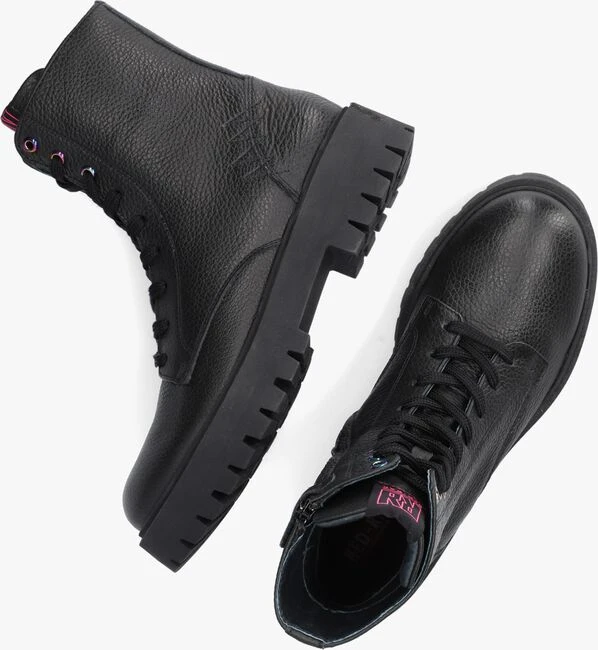 Deze veterboot van het merk RED-RAG past bij elke outfit! De boot is gemaakt van gestructureerd zwart leer en is erg soepel. Leuke details zijn de zes metallic veterringetjes en het roze merkembleem op de tong. Aan de binnenzijde zit een ritssluiting. De schachthoogte is 15 centimeter. De binnenkant bestaat uit leer en heeft een zacht uitneembaar voetbed. De rubberen zool geeft een stoere look aan de boot en zorgt voor voldoende grip.