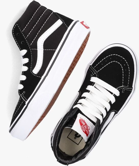 De bekende SK8-HI UY hoge sneaker is een legendarisch model in de collectie van het merk Vans. Deze hoge zwarte skateschoen is uitgevoerd in suède en canvas en heeft een voering van textiel met een vast voetbed. Opvallende details zijn de bekende leren lijn op de zijkant en de merklabels op de tong en de hiel. De neus is verstevigd met een stootrand en beschermt tegen slijtage. De gevoerde enkelkraag biedt ondersteuning en flexibiliteit en de rubberen zool met wafelprofiel biedt grip bij het lopen. Dit model heeft de klassieke stiksels met perforaties op de neus.