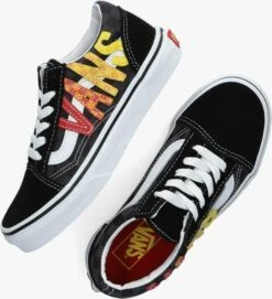 Deze populaire lage sneaker UY OLD SKOOL is één van de bekendste modellen van het merk Vans. Deze zwarte skateschoen is uitgevoerd in suède en canvas en heeft een voering van textiel met een vast voetbed. Opvallende details zijn de bekende leren lijnen op de zijkant, het merklabel op de hiel en het oversized merkembleem van leer in opvallende rode, oranje en een gele kleur. De neus is verstevigd met een stootrand en geeft bescherming tegen slijtage. De gevoerde enkelkraag biedt ondersteuning en flexibiliteit en de rubberen zool met wafelprofiel biedt grip bij het lopen.